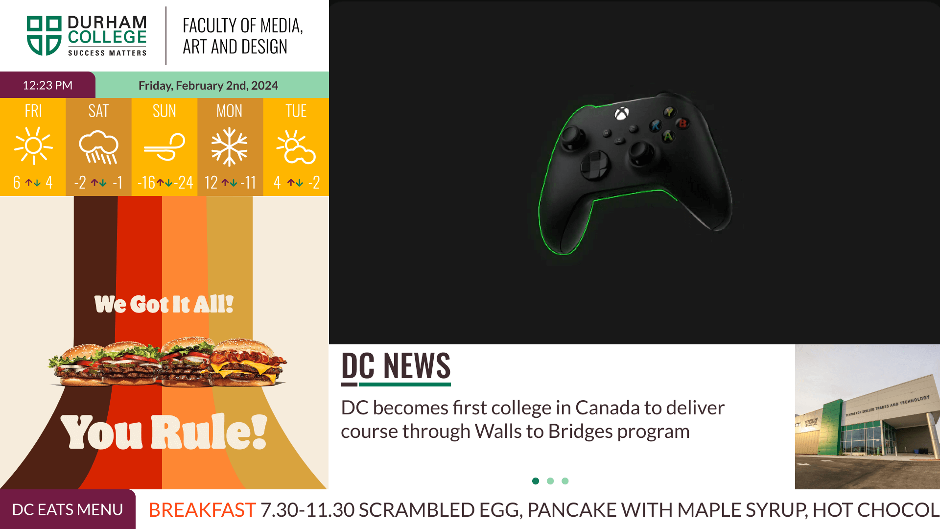 A digital signage designed and developed to be used in Durham College. It features motion graphic video ads, GSAP animation ads, news slider, menu ticker and live updating weather.