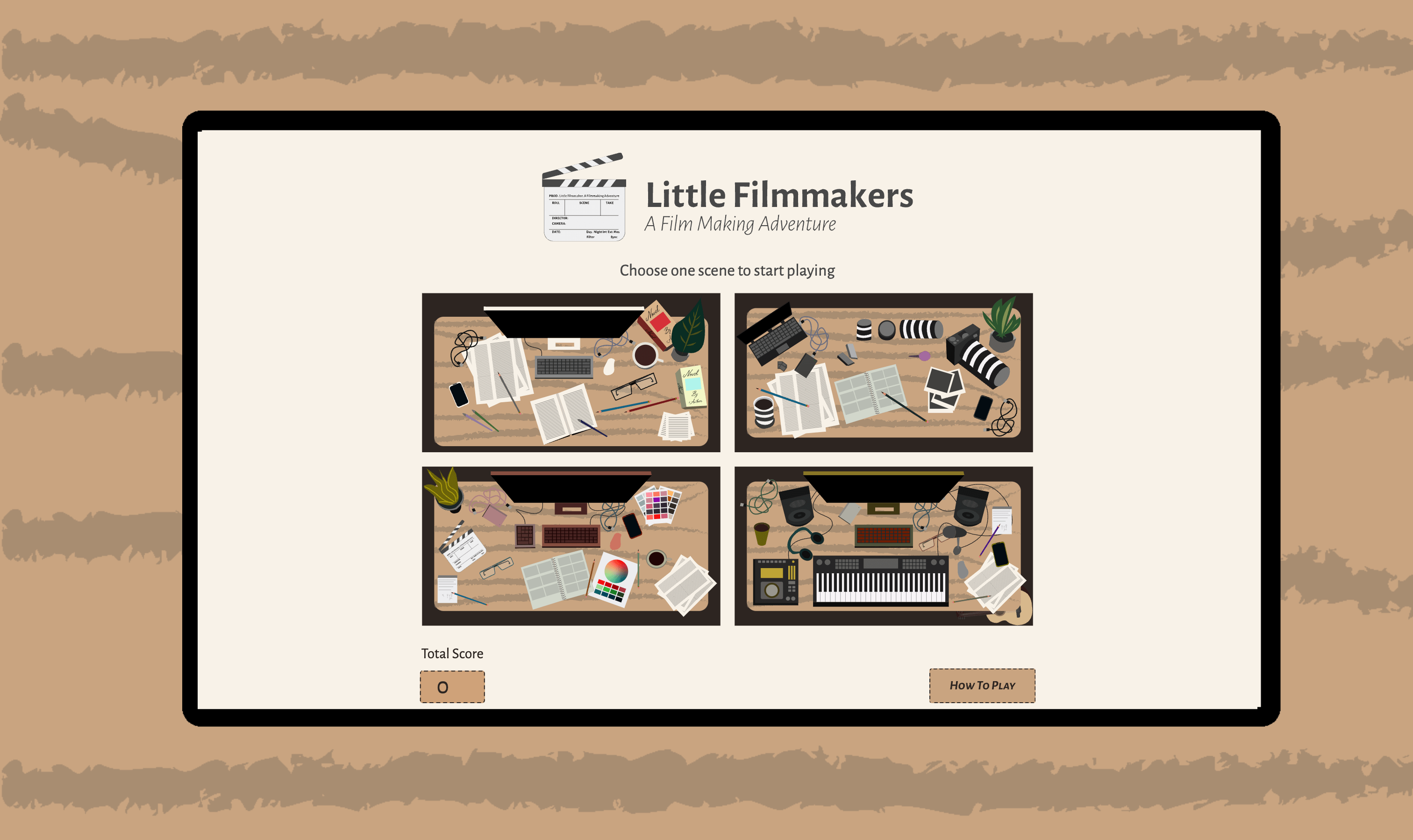A game designed to be played on tablets for kids aged 3-5. The objective of this game is to create interest and introduce the kids to the different stages of filmmaking.