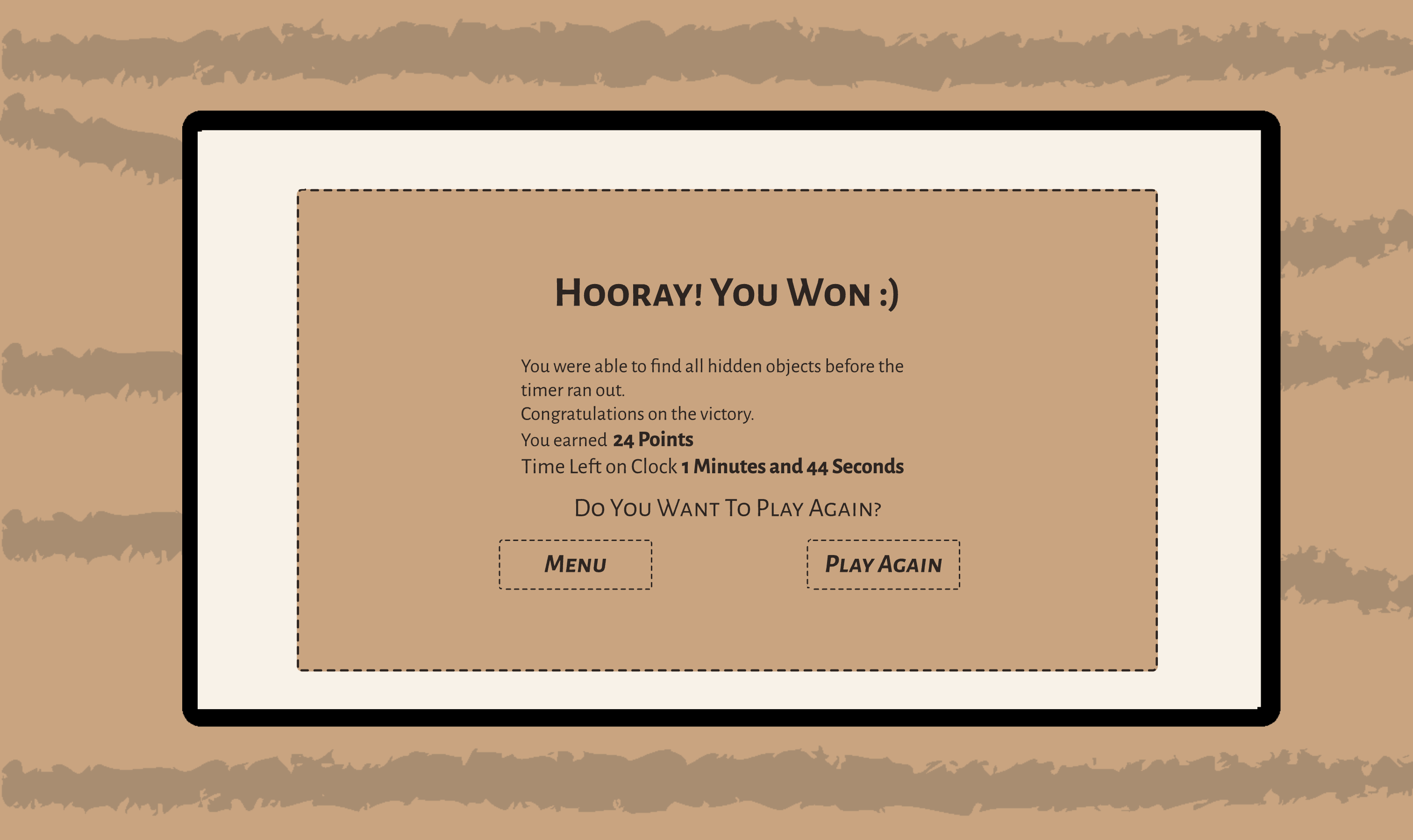 After the basic requirements were completed, I added the feature of timer, each puzzle is given a timer and the user only wins if they are able to find all the 5 objects within that time limit.